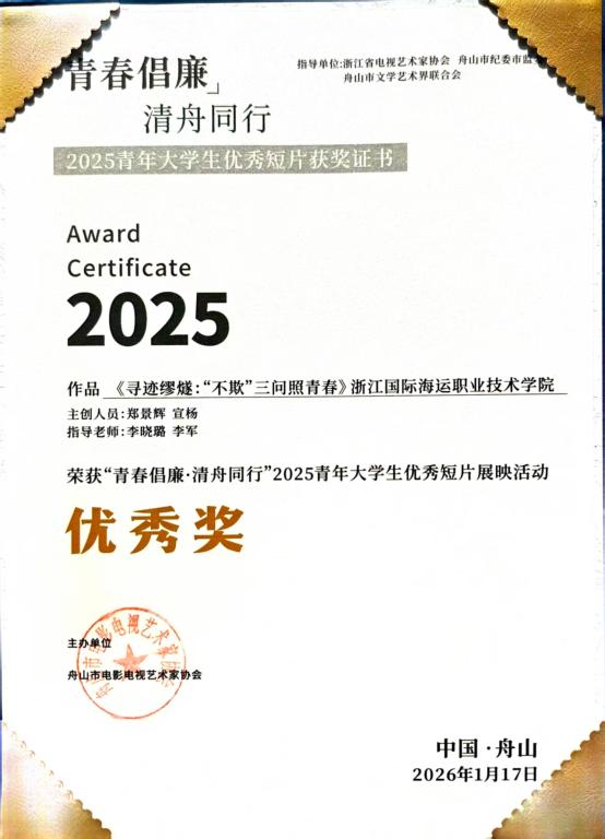 近日,由浙江省电视艺术家协会指导,舟山市纪委市监委、舟山市文联主办,舟山市电影电视艺术家协会承办的第三届青年大学生短片短剧“金水仙奖”评选结果正式揭晓。我校由李晓璐、李军老师指导,航海工程学院郑景辉、现代港口贸易学院宣杨创作的作品《寻迹缪燧:“不欺”三问照青春》从众多参赛作品中脱颖而出,荣获大赛优秀奖。